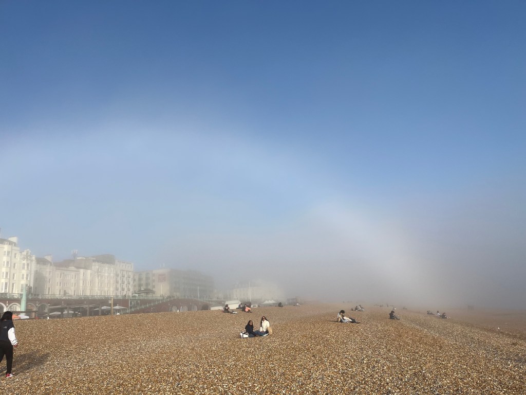 The fog was camped on the beach and afforded us the joy of seeing a fogbow as the sun tried to penetrate the fog.